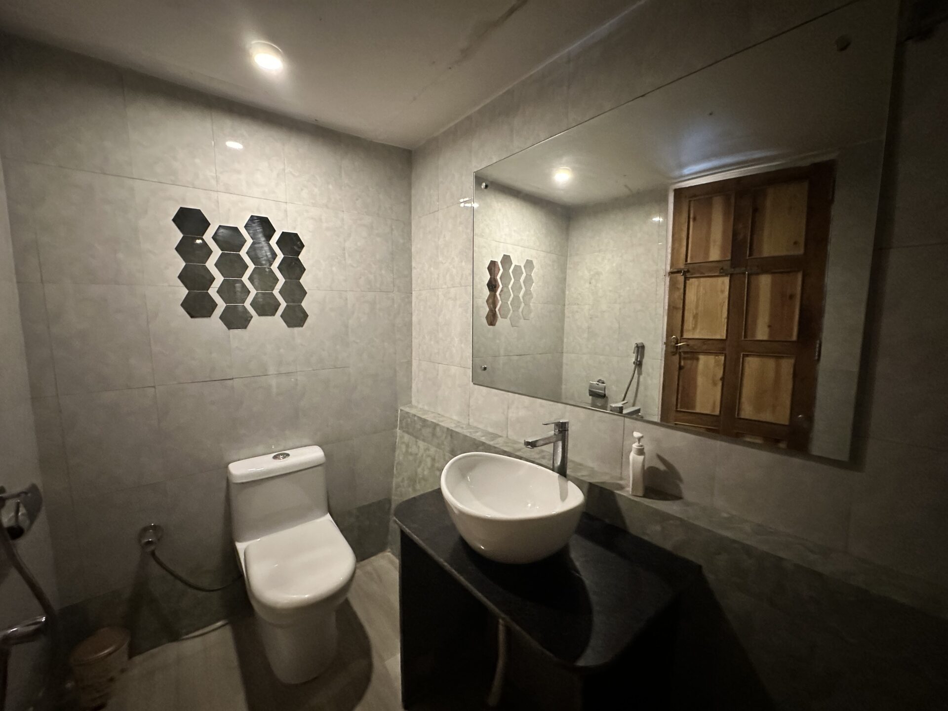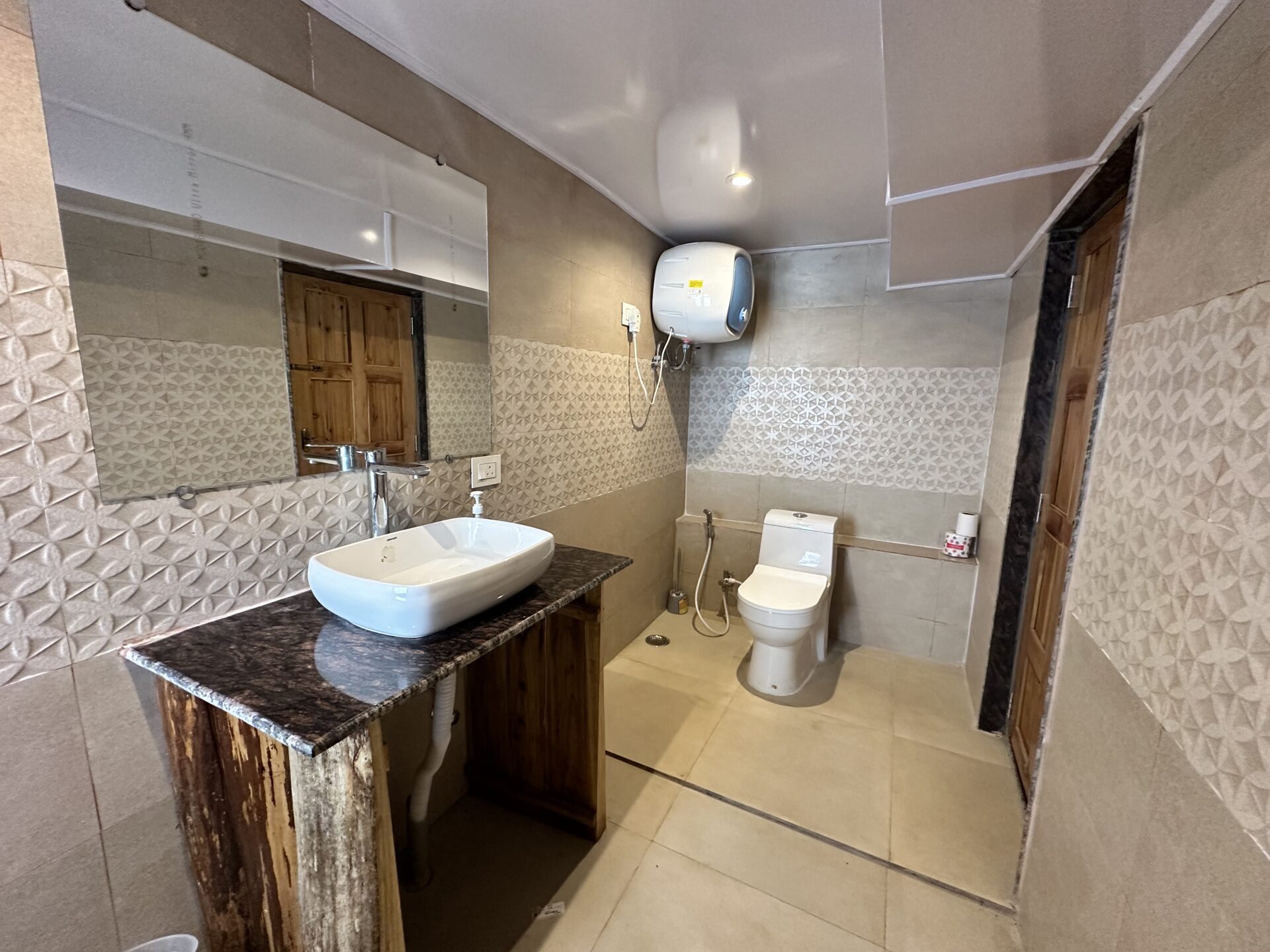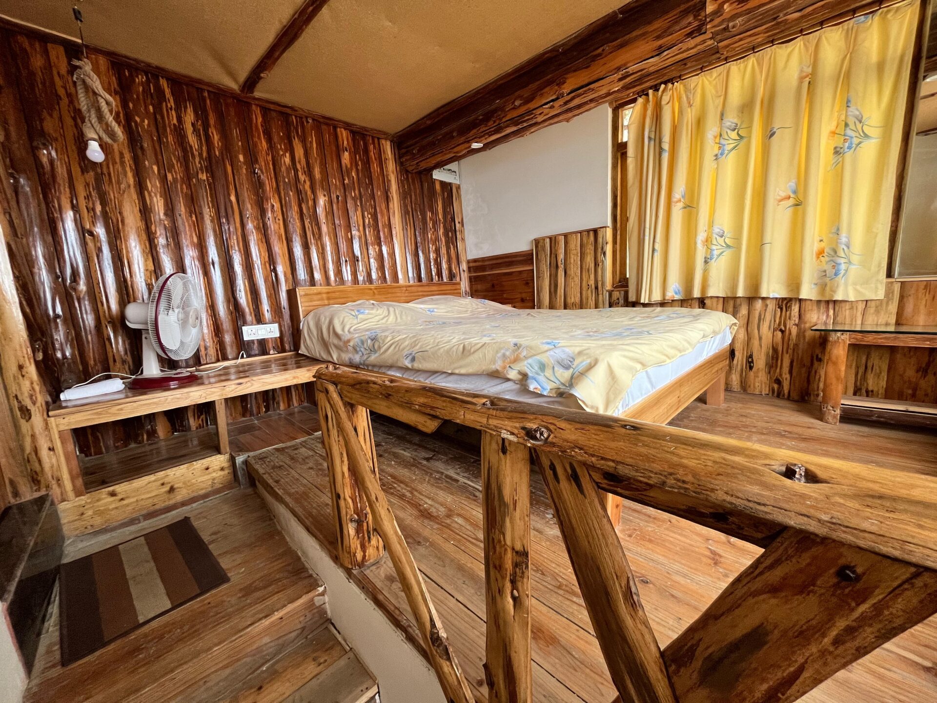 The Mountain Suite is a comfortable rustic haven set far away from the road on a mountain slope. One has to walk down 4 flights of stairs to reach the suite, so it is best suited for reasonably fit people. The suite has two bedrooms and a living room on two levels with stairs connecting them, and three bathrooms. The large common terrace has plenty of seating and a swing to enjoy the stunning mountain views. A common kitchen is available for preparing snacks, and complimentary breakfast is included with every reservation.