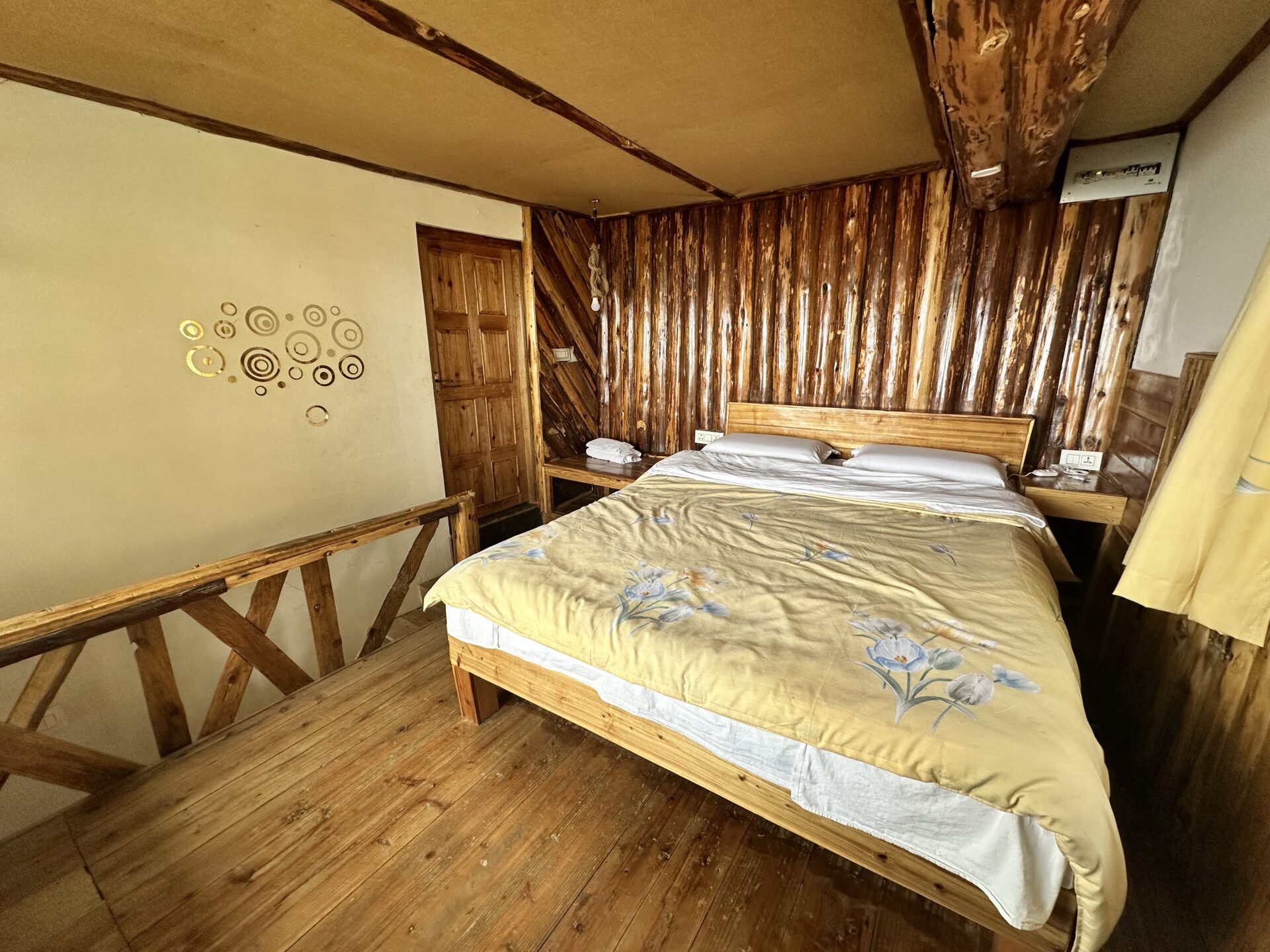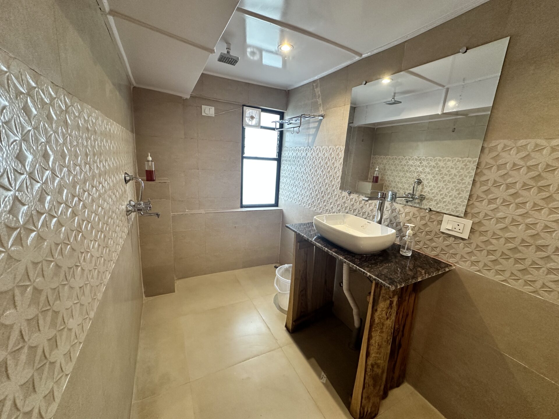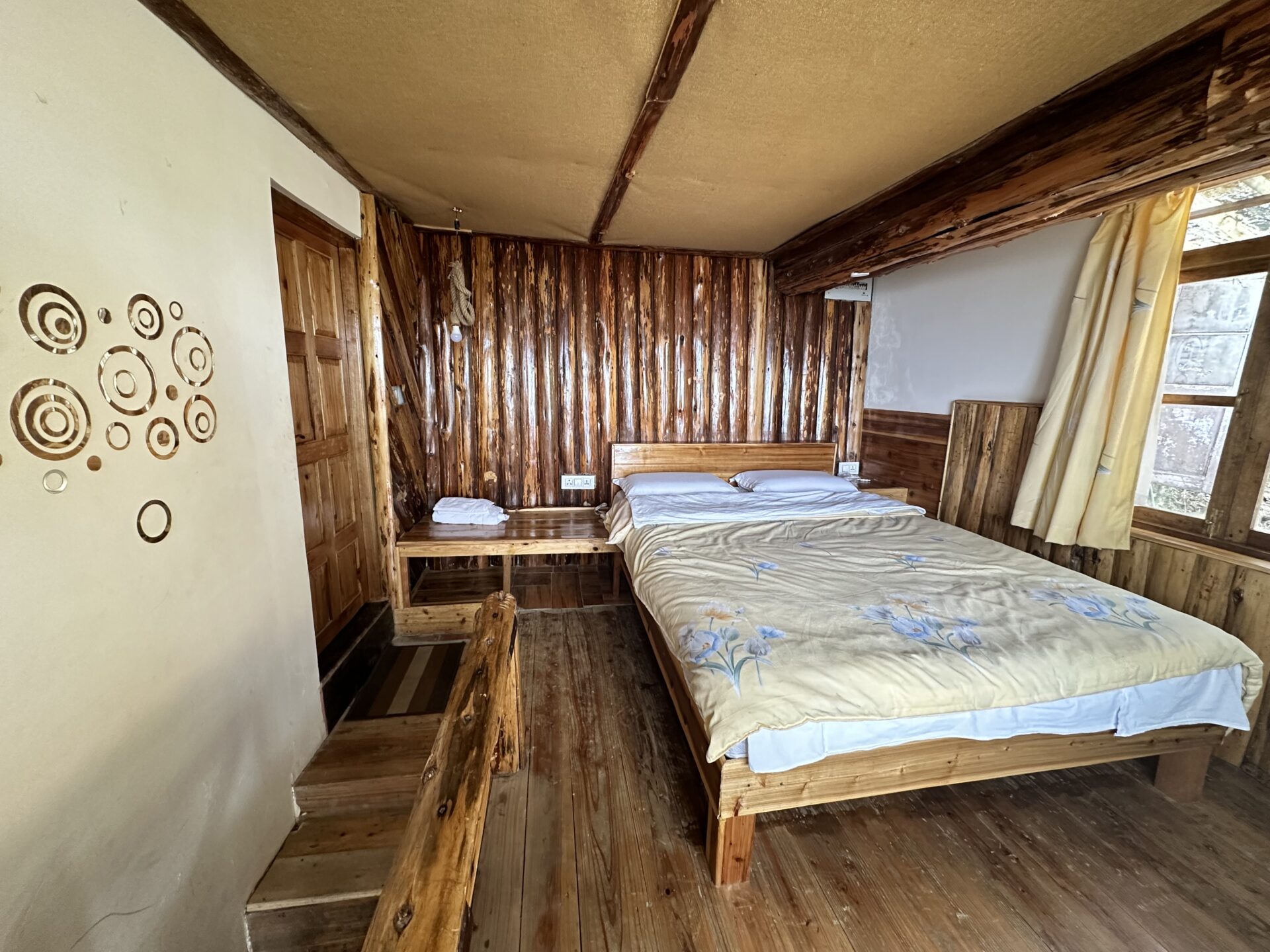 The Mountain Suite is a comfortable rustic haven set far away from the road on a mountain slope. One has to walk down 4 flights of stairs to reach the suite, so it is best suited for reasonably fit people. The suite has two bedrooms and a living room on two levels with stairs connecting them, and three bathrooms. The large common terrace has plenty of seating and a swing to enjoy the stunning mountain views. A common kitchen is available for preparing snacks, and complimentary breakfast is included with every reservation.